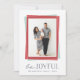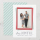 Modern holiday photo card features your favourite vertical photo framed by geometric elements in cranberry red and icy mint green. "Be Joyful" appears beneath in a combination of handwritten script and block lettering. Personalise with your family names and the year in muted midnight blue for a chic statement. Cards reverse to ice and white diagonal stripes.