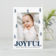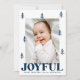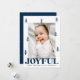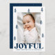 Celebrate the season with this festive photo Christmas card featuring your vertical photo framed by elegant navy hand-drawn pine trees on a crisp white background. Bold navy "Joyful" lettering showcases your personalised holiday greeting and family name below. The card reverses to reveal an additional photo set against a coordinating navy background with subtle white dots, making it a perfect way to share warm, festive wishes.