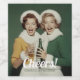 Two cheerful women dressed in elegant winter outfits smile brightly as they toast with champagne. Their cozy fur-trimmed jackets in green and yellow pop against the deep green backdrop. With festive energy and vintage charm, the scene captures the warmth, excitement, and camaraderie of a celebratory winter moment.