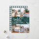 Beautiful typography based holiday photo card features four of your favourite square family photos in a collage layout. "Joyful Wishes" appears in the centre in white hand lettered typography on a hunter green background accented with white sketched leaves and red holly berries. Customise with your personal greeting, family names and individual names. Cards reverse to a pattern of white snow and stars on a festive green background.