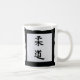 White mug marked with black kanji symbols denoting ju-do in a black oriental style frame.