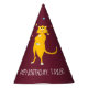 Top of your birthday party or other special event with some cute paper party hats. These party supplies feature a cute cartoon illustration of an orange cat juggling balls set against a maroon coloured background, and is ready to be personalised with your message in white lettering.