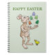 The Easter Bunny juggles the Easter eggs while the little chicken is the audience.