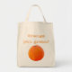 The orange, in the original artwork by ZoeSPEAK on this Tote Bag, is spinning around, ready to be juiced. The texture of the orange skin is highlighted by the change in colors, from very dark reddish orange to medium then light yellow orange at the edge. A wavy green stem tops the fruit. Great for groceries, the text on this tote bag says “Orange you green?”, but this can be changed or deleted as you like.