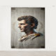 This modern, realistic portrait of Julius Caesar shows the legendary Roman leader in a contemporary, artistic style. His striking, sharp facial features, his briefly relaxed hair and the determined expression give him an aura of authority and intelligence. The background is subtle, with references to ancient Roman elements such as marble structures and laurel wreaths that convey depth and historical significance. The portrait combines historical authenticity with modern flair, ideal for art collectors and lovers of classical antiques who appreciate a powerful and timeless depiction of Caesar.