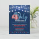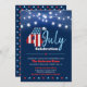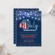 Get ready to celebrate our country in style when you send out these striking, graphic, patriotic, personalised, Fourth of July Independence Day party invitations. Bold country, rustic “4” American flag, white baby blue, and red typography, along with string lights and tiny stars overlay a navy blue background. A tiny, festive, baby blue and red star pattern overlays a navy blue background on the back. Customise with all your party information. Sure to generate excitement for your big summer event!