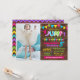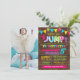 Jump birthday bash invitation, hot pink, purple, teal, yellow and lime colour scheme with a faux wood background suitable for any age. Add your own wording and photo into the template, to resize photo and more customisation (font colour, font style, move elements, background), click on personalise, scroll down and click on link "click to customise further".
