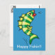 A green and yellow coloured jumping fish with a big red mouth, a fun drawing by Ans Collijn © Cool postcard to wish somebody Happy Fishin'!