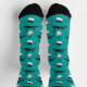 These cute socks for the cat lover feature a pattern of funny black and white cartoon cat images jumping across the surface. In addition to the jumping cats are cartoon cat faces. Everything is placed on a bright teal green background.