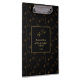 Clipboard template in gold colour ideal for horse care, horse training, veterinarian services. This elegant design shows jumping horse with horse pattern and your name .