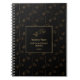 Notebook template in gold colour ideal for horse care, horse training, veterinarian services. This elegant design shows jumping horse with horse pattern and your name .