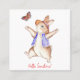 This adorable watercolor illustration captures a happy spring bunny mid-leap, wearing a charming straw hat and blue floral vest, with arms wide open in pure delight. A delicate butterfly flutters nearby, adding a touch of whimsical spring magic.