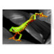 Acrobatic lime green tree frog with orange and black stripes on its belly, looks like he’s doing a handstand. Very colourful leaping amphibian on a black and white background.