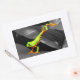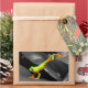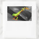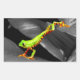 Acrobatic lime green tree frog with orange and black stripes on its belly, looks like he’s doing a handstand. Very colourful leaping amphibian on a black and white background.