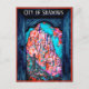 A girl with a sfaff looking at a fantasy city on the hill, or at a mirage. Seen through an ancient wooden gate. The text is customisable. A tarot-like image not for fortune telling, but for bringing more direction (or surprise) to someone life, to ponder, to understand, to learn, to wonder. By Alexandra Cook aka Linandara