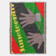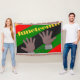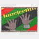 This throw blanket has a Juneteenth design of hands in broken chains with a background of red, yellow, green, and black lines.