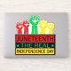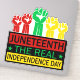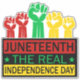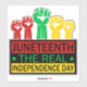 Social justice and Black History car decal features raised fists with "Juneteenth - the Real Independence Day" text in Pan Africa colours combo