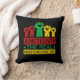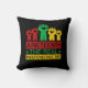 Social justice and Black History word art throw pillow features raised fists with "Juneteenth - the Real Independence Day" text in Pan Africa colours combo on black background