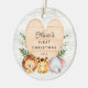 Cute baby's first Christmas ornament featuring the sweetest little elephant, giraffe and lion with a wood slice heart set on a rustic wood background.