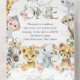 Invite friends and family in style and set the tone for your special day with this charming birthday invitation. Design features jungle animals (giraffe, zebra, lion, elephant, cheetah, rhino), hibiscus flowers and eucalyptus leaves on white background.