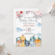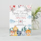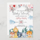 Cute jungle animals with watercolor blue clouds and red and white flowers on the top of the invitation