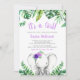 Adorable purple girl elephant baby shower invitation design featuring watercolor tropical leaves and baby elephant.