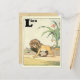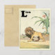 Alphabet letter L is for "Lion" printed on top of the postcard with bold letters to help kids and ESL students learn their ABCs. Lion with a bushy mane of hair, prowling on the open desert savanna, from a drawing by artist Benjamin Rabier.