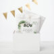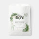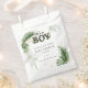 Wild forest themed giraffe, and elegant boys safari animal baby shower favour bag featuring a giraffe, an elephant, gold foil and green leaves.