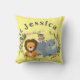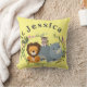 This bright and cheerful creation features jungle safari animals surrounded by green and pink botanical leafing against a bold yellow background. Personalise with your name to go with the lion, monkey, and rhino in this gender neutral design.