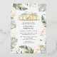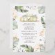 Wild, calm, and elegant safari animal baby shower invitation featuring a giraffe, gold effect and green leaves.