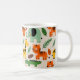 The mug features a seamless pattern of cartoon-style jungle animals against a light beige background. These animals include an orange tiger with black stripes, a mint green elephant, a yellow giraffe with brown spots, a green crocodile, and a brown turtle. Stylised green and brown leaves are interspersed throughout the pattern. The animals are depicted with simple shapes and bold outlines, creating a playful and whimsical design. The overall aesthetic is cheerful and vibrant, making it suitable for children's products or designs with a jungle theme.
