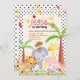 PixDezines jungle theme for a fun birthday bash. Featuring baby animals, pink hippo, a purple elephant, yellow polka dots giraffe, tiger cub as well as a cheeky little brown monkey riding on an elephant head. Zebra print is a finishing touch on the background.