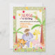 PixDezines jungle theme for a fun birthday bash. Featuring baby animals, pink hippo, a purple elephant, yellow polka dots giraffe, tiger cub as well as a cheeky little brown monkey riding on an elephant head. Zebra print is a finishing touch on the background.