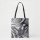 A toucan with a prominent beak is depicted amid swirling monochromatic patterns that evoke a sense of movement of jungle leaves. The high-contrast design accentuates the bird's features amidst the abstract shapes surrounding it.