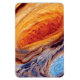 The red spot of Jupiter shown in closeup detail, with swirling orange and blues that resemble a tie dye psychedelic Van Gogh painting.