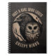 This notebook features the text "Just a girl who loves creepy birds" paired with a graphic of a raven and an owl. The color scheme is vintage neutral with off-black and cream shades. The owl stares forward at the viewer while the black bird watches obliquely.
