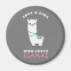 An adorable white llama decorated in traditional tassels and saddle. Text reads: "Just a Girl who loves Llamas".