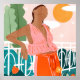A woman leans back, soaking in the warm sunlight, surrounded by lush greenery and blooming flowers. Soft pastels and bold oranges create a dreamy, relaxed summer vibe. The scene captures a peaceful moment of quiet warmth and effortless beauty.