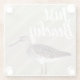 Just beachy white chunky script with a brown sand piper bird over a sand background. These glass coasters are great for a soft coastal or nautical vibe.