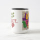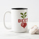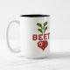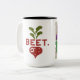 A playful mug design featuring the text "Just Beet It" in a multi-coloured font, reminiscent of a healthy and energetic lifestyle. The text is centred on the mug, with a small beet illustration in the corner, a small leaf, and a small heart, all in a playful, multi-coloured style.