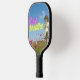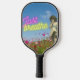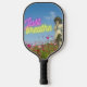 Standout on the court with this fun pickleball paddle that mixes a variety of elements : a vintage tinted photo cutout of an angel / fairy on background of blue skies and flowers with neon pink and yellow "just breathe"