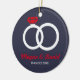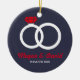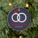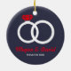Christmas gift idea for engagement, wedding. Xmas red and blue ornament with wedding rings. Gift idea for just engaged or married couple.