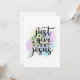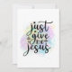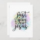 Inspirational quote scripture flat greeting card depicts a simple abstract watercolor background with pastel colours of blue, lavender and yellow brush strokes on a white background. It features the title of a Christian Worship song, "Just Give Me Jesus." The back Bible Verse 2 Corinthians 3:18, "But we all beholding the glory of the Lord with open face, are transformed into the same image from glory to glory, as by the Spirit of the Lord." The back verse and greeting prayer can be personalised or deleted for a hand written note.
