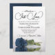 This romantic wedding invitation features a single long-stemmed dusty steel blue or blue-gray colored rose lying on its side mirrored in a pool of water. The heading is written in elegant script lettering and reads: Nothing Fancy, Just Love. The back has space for your photo in a marbled steel blue colored frame. This invite is a wonderful combination of modern and timeless, with a whimsical twist - a perfect way to invite your friends and families to share in your joy on your special day, whether it be a formal or casual occasion!