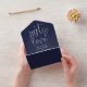 This all-in-one minimalist wedding invitation features elegant typography on a navy blue background. The invitation includes a perforated RSVP card with your wedding website QR code. Designed by Thisisnotme©