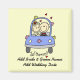 A customisable Just Married wedding magnet featuring a bride and groom stick figure in the wedding car, text that reads "Just Married!" and a place you can easily add the bride and groom's names and wedding date!