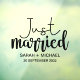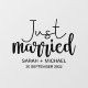 Spread the news of your wedding with this romantic "Just Married" sticker featuring a modern black script font text decorated with lovely hearts and easily customisable with the bride and groom's names and wedding date.