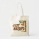 For all the jungle lover newlyweds! Featuring a monkey hanging from the vines of a tree, holding a banana. Tiger stripes spell out "Just Married" in big bold letters.