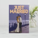This custom wedding announcement features a fun and romantic custom photo design. The phrase "Just Married" is printed across the top in neon lights. A sample photo of an eloped bride and groom taken at night covers the background which you can personalise to include your own custom photo of the married couple, or another image of your choice. A sample wedding announcement from the newlywed couple is printed on the back.