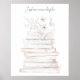 A romantic pile of books in white and gold, with a delicate hint of blush pink, and on top is a bunch of white flowers. 'Just one more chapter' is written in a handwritten, cursive text. Lovely piece of wall art, and a great gift for a book lover.